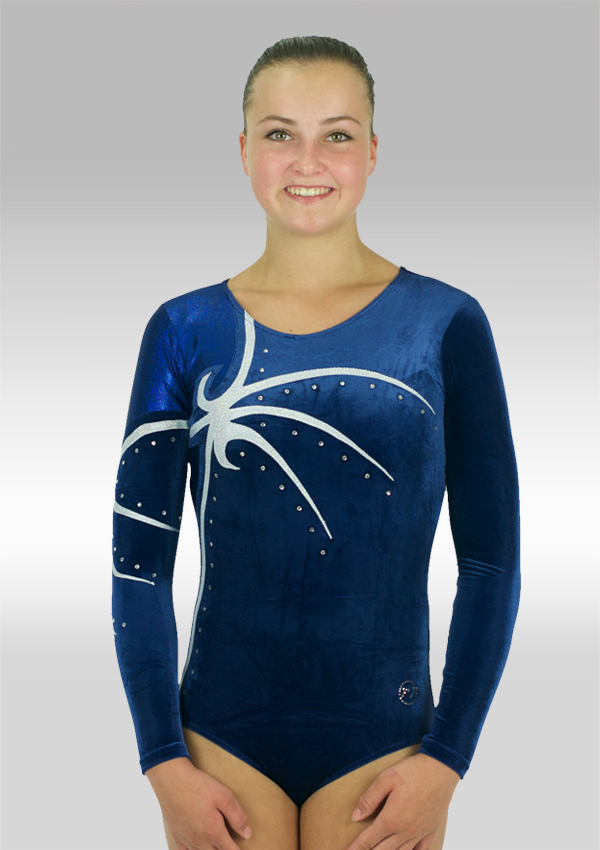 Elegant modell i marineblå glatt velur kombinert med marineblå metallic wetlookstoff. Flotte glitterstener langs med detaljstriper i sølvfarget glitterstoff gir drakten en eksklusiv look. Ønsker du tilhørende leggings velger du ifra kategorien “glatt velur”